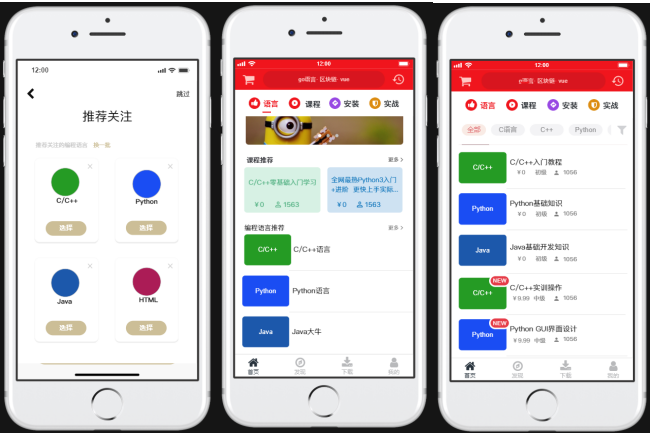 登录之后,会有推荐关注的编程语言,用户可以选择自己感兴趣、想学习的编程语言;语言和课程按钮里面会有相应语言的学习课程推荐,分别有初级、中级和高级;安装按钮里面主要是相应编程语言使用工具的下载安装推荐和问题解决方案;实践按钮里主要是对于课程学习之后,可以用相应语言和工具进行部分软件实战开发的课程。
