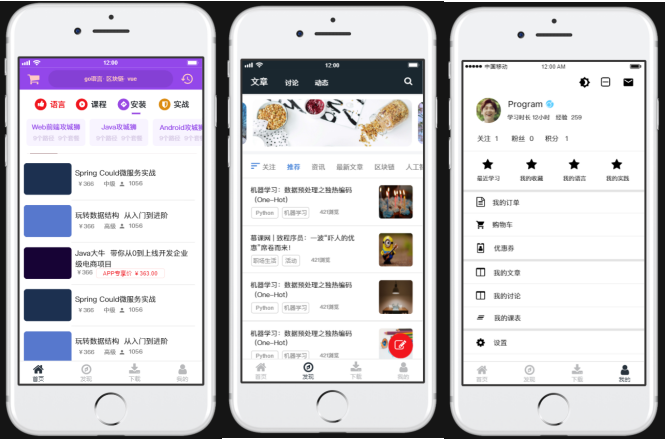 APP里面还包括一些文章的交流分享和讨论区,可以在里面进行个人作品分享和他人作品阅读;个人信息里面包括自己学的课程和收藏等等。