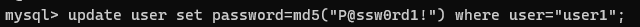6.使用mysql内置MD5加密函数加密用户user1的密码为(P@ssw0rd1!)。