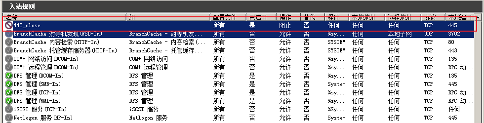 windows高级防火墙-->入站规则-->新建规则--端口--TCP&特定本地端口445-->阻止连接-->下一步-->完成