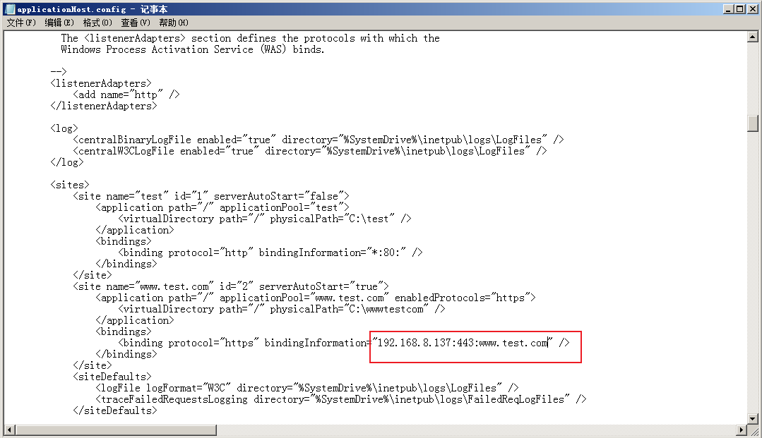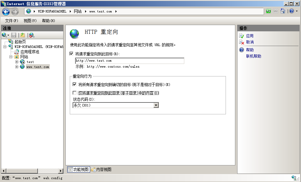 7.对Web网站进行HTTP重定向HTTPS设置,仅使用HTTPS协议访问网站(Windows)(注:证书颁发给test.com 并通过https://www.test.com访问Web网站)。