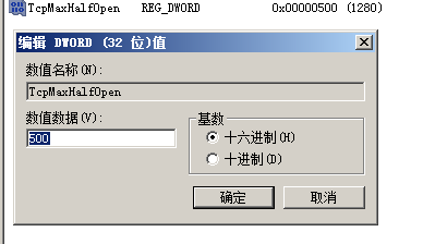 开始->运行->键入regedit,在注册表项HKEY_LOCAL_MACHINE\SYSTEM\CurrentControlSet\Services\Tcpip\Parameters 下,值名称为TcpMaxHalfOpen,推荐值为500