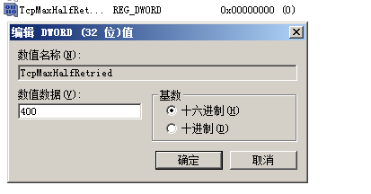 开始->运行->键入regedit,在注册表项 HKEY_LOCAL_MACHINE\SYSTEM\CurrentControlSet\Services\Tcpip\Parameters 下,值名称为TcpMaxHalfOpenRetried,推荐值为400