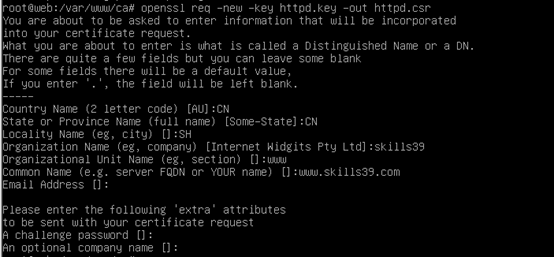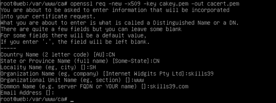 C 再然后 req用来生成自签证书 -new 生成请求证书文件 -x509 生成自签签名 -key 指定已有私钥,-out 指定生成的证书请求或者自签名证书名称, 然后下面的根据题目实际情况填写