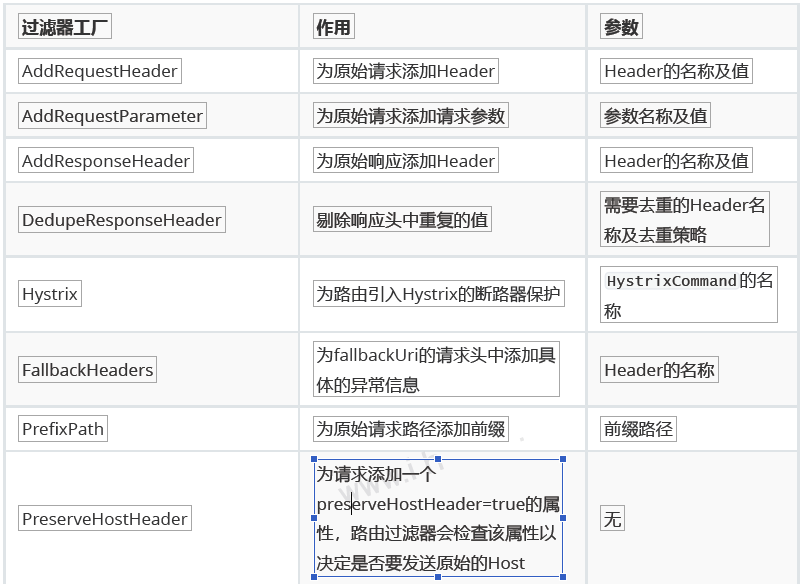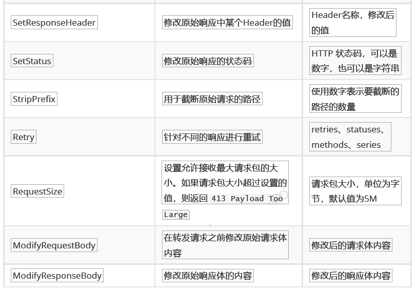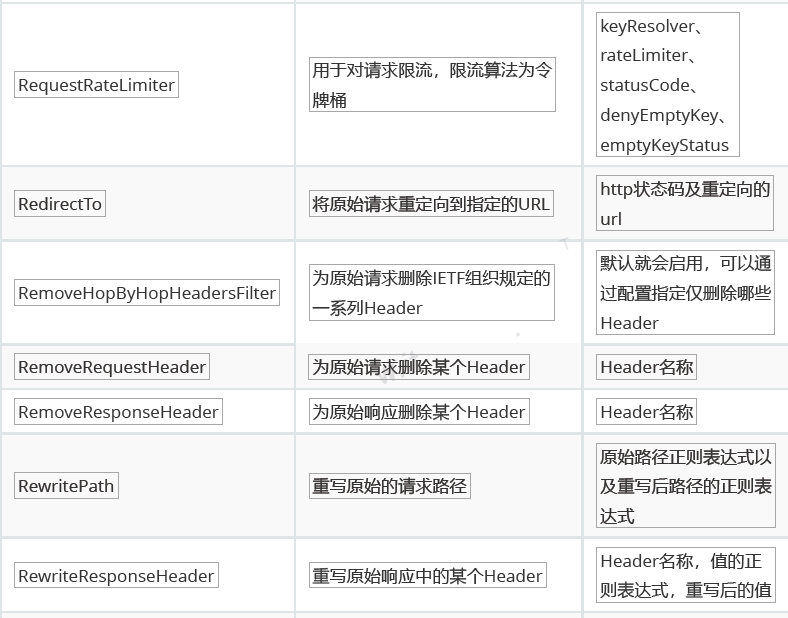 filters: # 过滤器,请求在传递过程中可以通过过滤器对其进行一定的修改