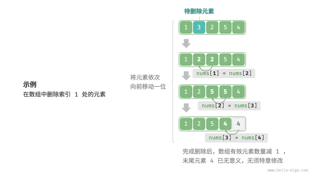 删除索引 i 处的元素,则需要把索引 i 之后的元素都向前移动一位。