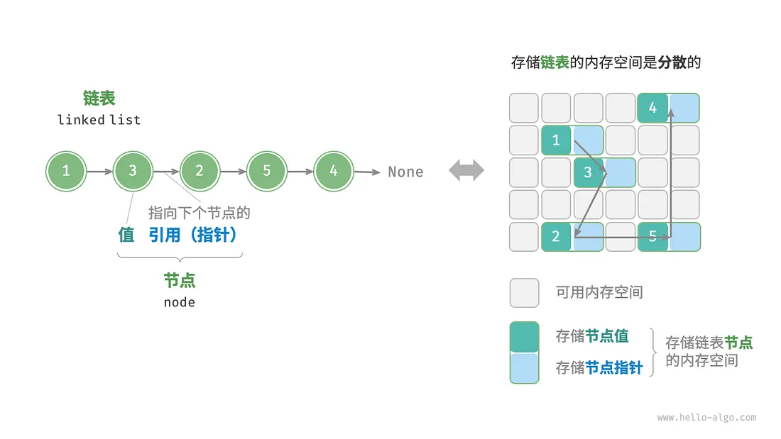 - 每个节点含 值、引用(指向下一节点的指针)。