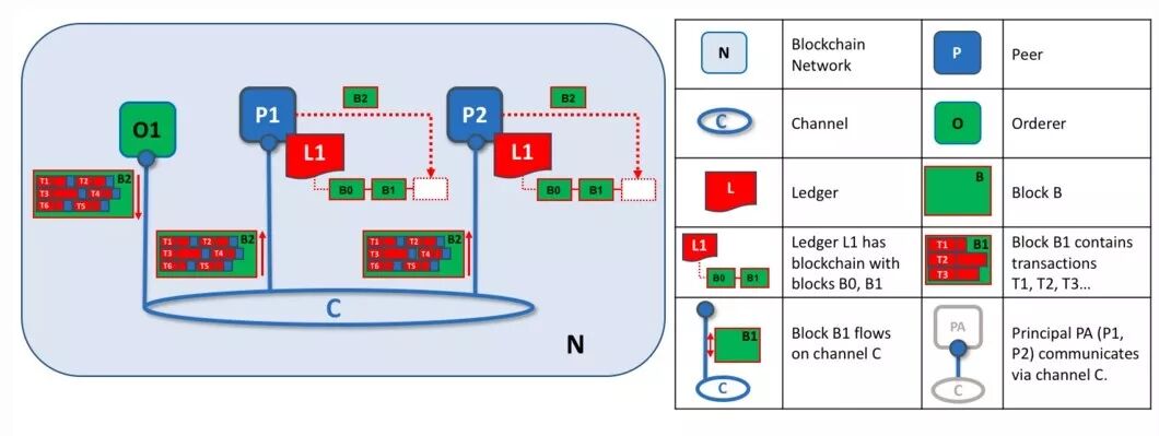 O1 把 block B2 发给 peer P1 和 P2 。P1 处理 B2,添加一个新的 block 到 P1 的 L1 上。并行地,P2 也处理 B2 ,添加一个新的 block 到 P2 的 L1 上。一旦这一过程完成,L1 就在 P1 和 P2 上被一致更新了。然后它们分别通知自己连接的 applications ,Transaction就被处理了。