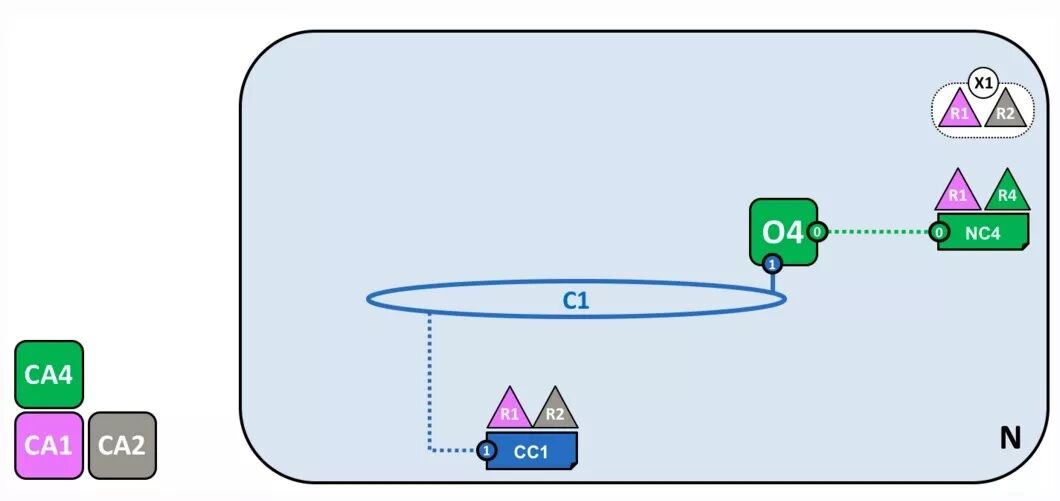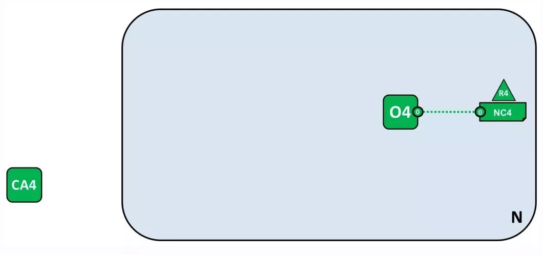 放眼过去,是不是觉得很杂乱?不要急,接下来 Fabric 会告诉我们怎么一步步形成这样的复杂体系结构。先来看图中的 R4 以及它的网络配置文件 NC4,以及排序服务O4,和提供身份服务的 CA4。NC4 包含初始网络管理能力设置的策略。简单点说,就是 R4 有权配置网络。CA 的功能比较简单,基本上众所周知,就不再赘述了。