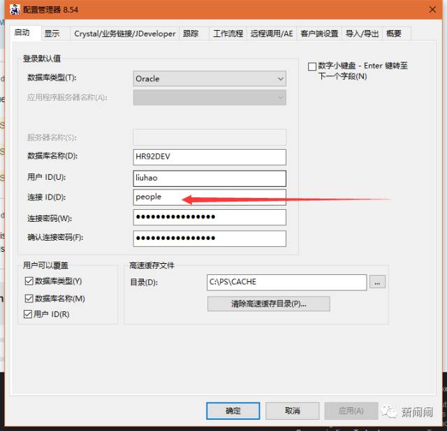 然后再观察错误发现表名PSOPRDEFN前有SYSADM账号,突然想起来AD工具连接数据库不是通过SYSADM账号,是用的people,如图: