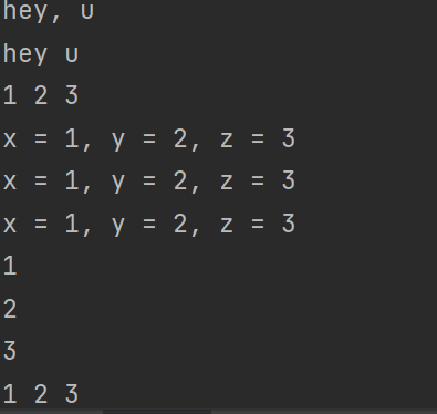 print('hey, u') print('hey', 'u') x, y, z = 1, 2, 3 print(x, y, z) print('x = %d, y = %d, z = %d' % (x, y, z)) print('x = {}, y = {}, z = {}'.format(x, y, z)) print(f'x = {x}, y = {y}, z = {z}') print(x) print(y) print(z) print(x, end=' ') print(y, end=' ') print(z)