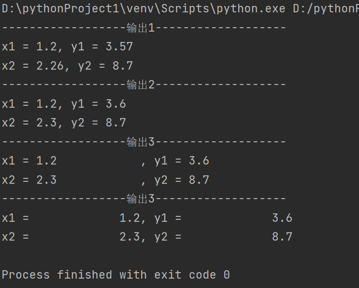 x1, y1 = 1.2, 3.57 x2, y2 = 2.26, 8.7 # 输出1 print('{:-^40}'.format('输出1')) print('x1 = {}, y1 = {}'.format(x1, y1)) print('x2 = {}, y2 = {}'.format(x2, y2)) # 输出2 print('{:-^40}'.format('输出2')) print('x1 = {:.1f}, y1 = {:.1f}'.format(x1, y1)) print('x2 = {:.1f}, y2 = {:.1f}'.format(x2, y2)) # 输出3 print('{:-^40}'.format('输出3')) print('x1 = {:<15.1f}, y1 = {:<15.1f}'.format(x1, y1)) print('x2 = {:<15.1f}, y2 = {:<15.1f}'.format(x2, y2)) # 输出4 print('{:-^40}'.format('输出3')) print('x1 = {:>15.1f}, y1 = {:>15.1f}'.format(x1, y1)) print('x2 = {:>15.1f}, y2 = {:>15.1f}'.format(x2, y2))