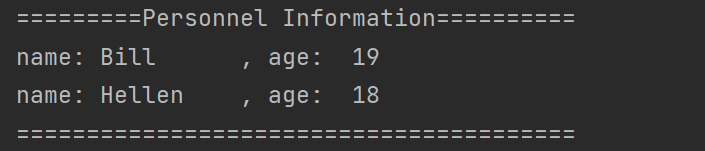 name1, age1 = 'Bill', 19 name2, age2 = 'Hellen', 18 title = 'Personnel Information' print(f'{title:=^40}') print(f'name: {name1:10}, age: {age1:3}') print(f'name: {name2:10}, age: {age2:3}') print(40*'=')