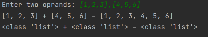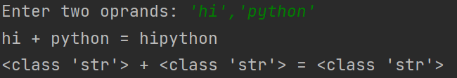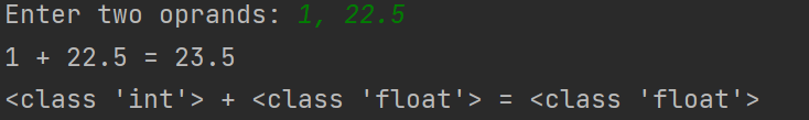 x, y = eval(input('Enter two oprands: ')) ans = x + y print(f'{x} + {y} = {ans}') print(f'{type(x)} + {type(y)} = {type(ans)}')