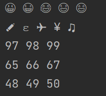 print(chr(0x1f600), end = " ") print(chr(0x1f601), end = " ") print(chr(0x1f602), end = " ") print(chr(0x1f603), end = " ") print(chr(0x1f604)) print(chr(10000), end = " ") print(chr(0x025b), end = " ") print(chr(0x2708), end = " ") print(chr(0x00A5), end = " ") print(chr(0x266b)) print(ord('a'), end = " ") print(ord('b'), end = " ") print(ord('c')) print(ord('A'), end = " ") print(ord('B'), end = " ") print(ord('C')) print(ord('0'), end = " ") print(ord('1'), end = " ") print(ord('2'))