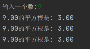 from math import sqrt n = float(input('输入一个数:')) ans1 = sqrt(n) ans2 = n**0.5 print('%.2f的平方根是: %.2f' %(n, ans1)) print('{:.2f}的平方根是: {:.2f}'.format(n, ans2)) print(f'{n:.2f}的平方根是: {ans2:.2f}')