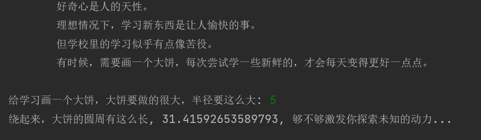 from math import pi text = ''' 好奇心是人的天性。 理想情况下,学习新东西是让人愉快的事。 但学校里的学习似乎有点像苦役。 有时候,需要画一个大饼,每次尝试学一些新鲜的,才会每天变得更好一点点。 ''' print(text) r = float(input('给学习画一个大饼,大饼要做的很大,半径要这么大: ')) circle = 2*pi*r print(f'绕起来,大饼的圆周有这么长, {circle}, 够不够激发你探索未知的动力...')