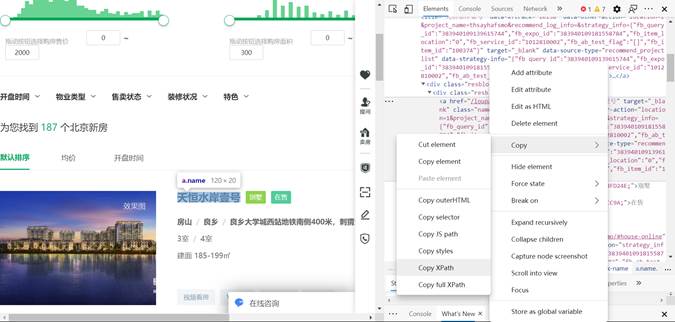 - 由[2],同上一次作业,我们需要爬取的元素有:名称,地理位置(3个字段分别存储),房型(只保留最小房型),面积(按照最小值),总价(万元,整数),均价(万元,保留小数点后4位)