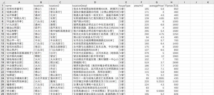 最终的csv文件,应包括以下字段:名称,地理位置(3个字段分别存储),房型(只保留最小房型),面积(按照最小值),总价(万元,整数),均价(万元,保留小数点后4位);