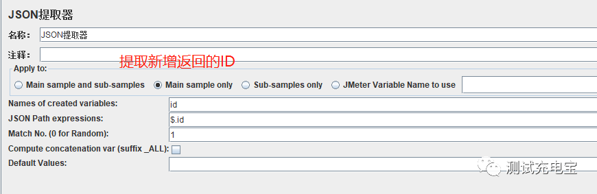 我们首先要把新增接口的id提取出来,用到json提取器,具体配置见下图