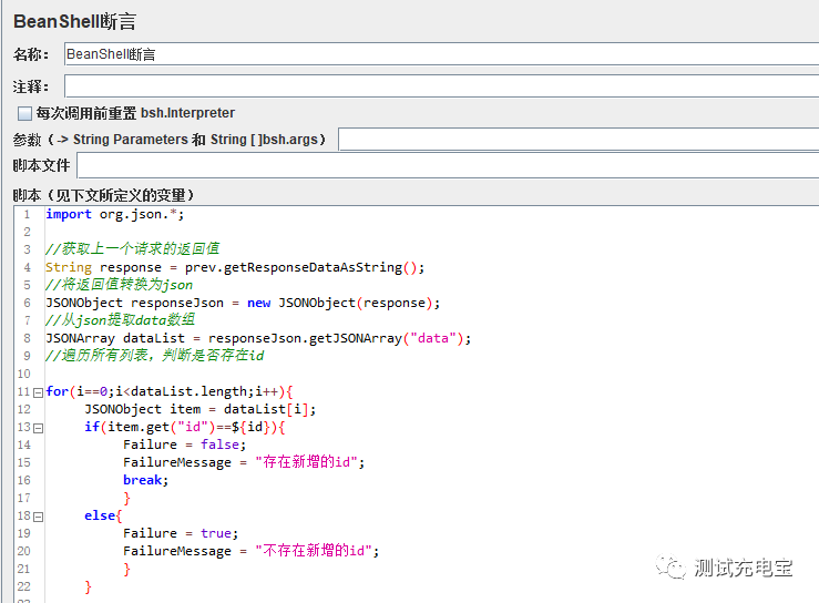import org.json.*; //获取上一个请求的返回值 String response = prev.getResponseDataAsString(); //将返回值转换为json JSONObject responseJson = new JSONObject(response); //从json提取data数组 JSONArray dataList = responseJson.getJSONArray("data"); //遍历所有列表,判断是否存在id for(i==0;i<dataList.length;i++){ JSONObject item = dataList[i]; if(item.get("id")==${id}){ Failure = false; FailureMessage = "存在新增的id"; break; } else{ Failure = true; FailureMessage = "不存在新增的id"; } }