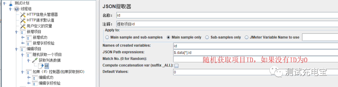 二、用【IF控制器】增强容错性使用创建成功返回的ID进行“编辑”和“删除”操作,如果创建项目失败,那么ID无法提取到,会导致下操作类的脚本全部报错。所有要操作数据从列表获取,如果获取到数据才进行“编辑”和“删除”操作,这样就解决问题了。继续改造脚本如下:经过随机获取项目ID,如果ID不等于0,则说明有数据可进行操作,如果id为0不会执行操作数据动作。