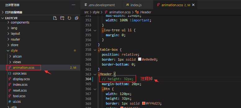 在这里,我们找到项目中的animation.scss 文件夹,去掉Header类的高度属性,可以发现上述的样式层叠错乱问题已经解决,样式恢复了正常。