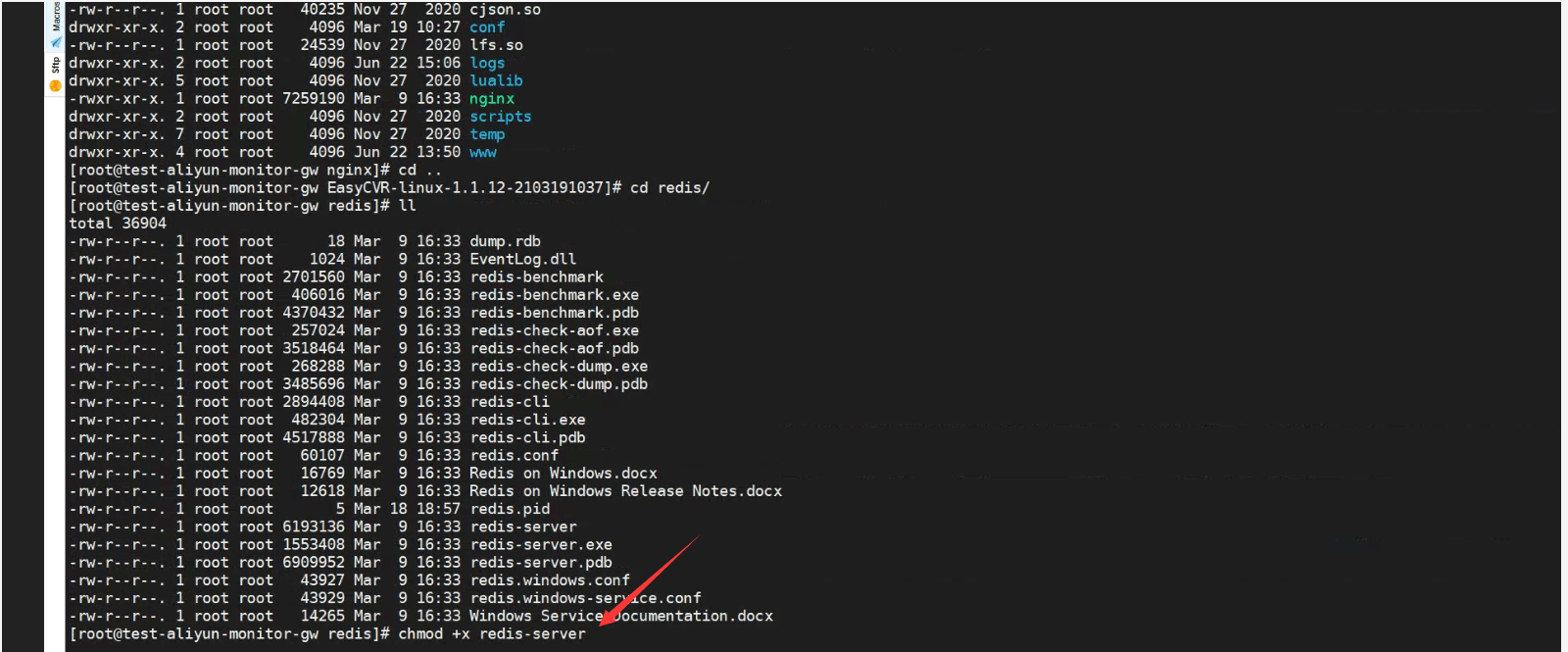 这个问题是一个比较常见的问题,原因是EasyCVR的redis-server文件在linux系统里面未获得读写的权限。一般来说EasyCVR内easycvr、nginx、start.sh、stop.sh以及redis-server这些执行文件是需要获取linux的读写权限的,只要其中有一个没有权限,则服务就会无法成功启动,所以这里需要把这个文件给上权限。