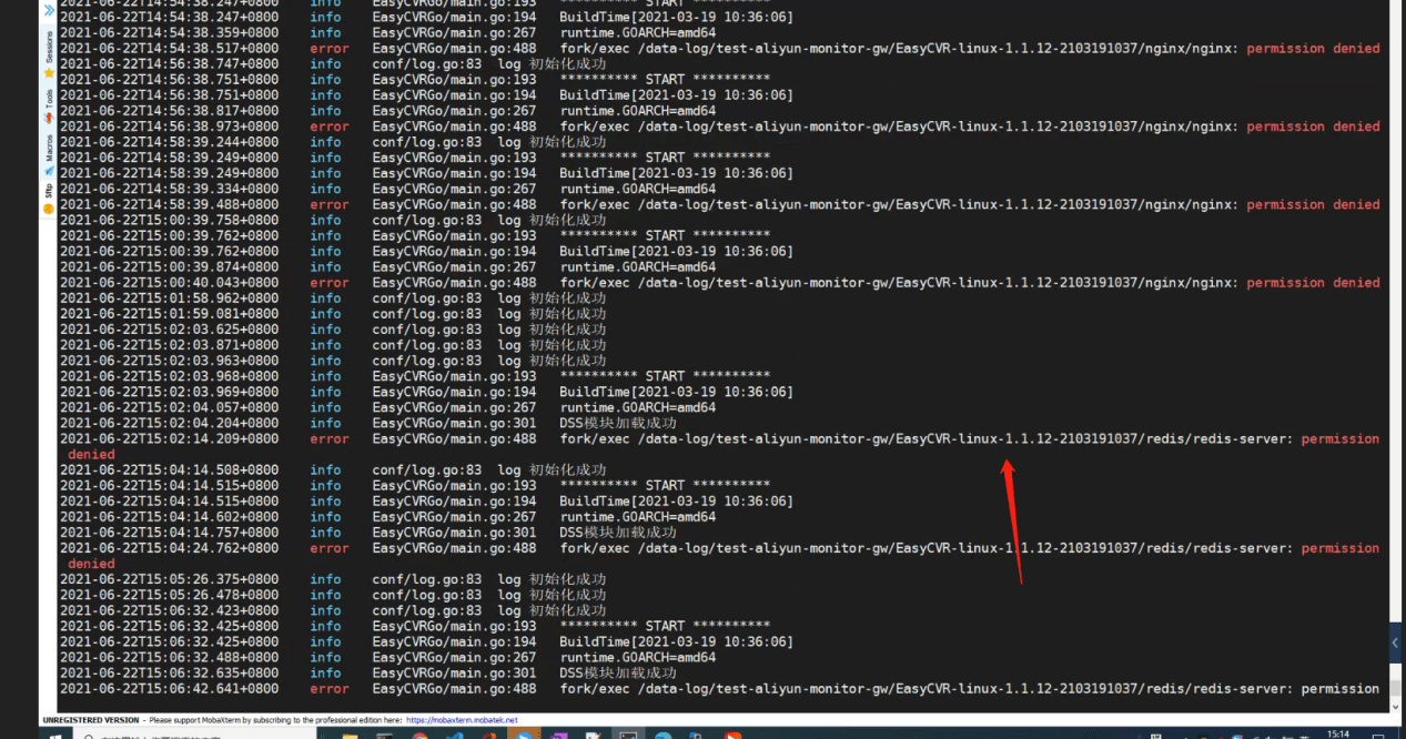 EasyCVR平台在客户现场安装调试的时候,有可能出现启动不起来的情况,这时我们第一件事情就是先检查log日志,打开log日志找到当日的日志,打开后拉到最底下看到EasyCVR启动的时候报错permission denied。