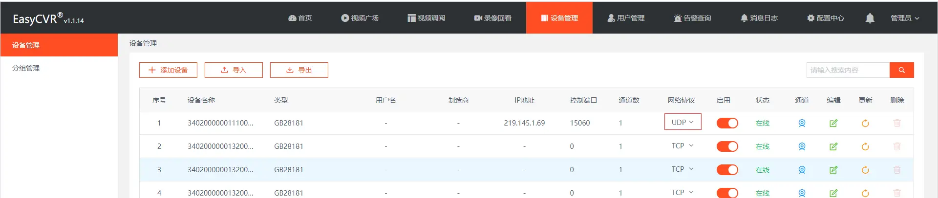 2、支持国标GB28181设备注册和注销,对所有设备进行管理,获取资源,对资源列表进行管理