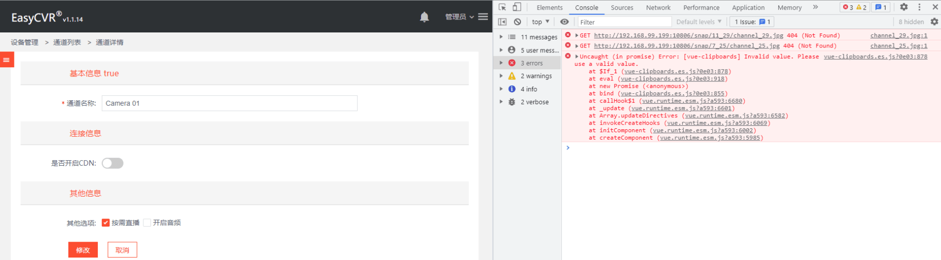 EasyCVR安防视频云服务经过不断的研发与细化,已经增加了很多新的功能和操作方式,比如用户管理、设备分组、告警查询等,都是方便用户、完善平台管理的一些功能。在前端开发人员对EasyCVR进行页面编译时,编辑通道控制台出现错误信息:Error: [vue-clipboards] Invalid value. Please use a valid value.
