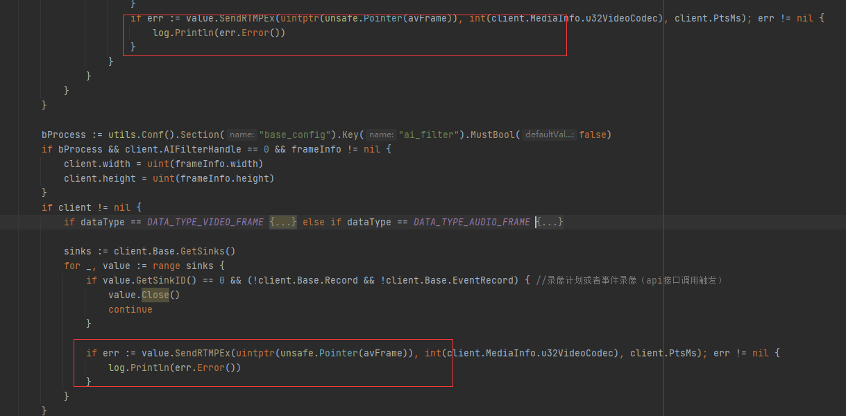 改成异步操作后,运行程序,在VLC播放还是会出现花屏现象。还需要把人脸识别这段代码给注释“go client.Base.FaceDetection()”;运行程序使用vlc播放,花屏现象就不会出现了。