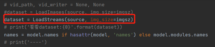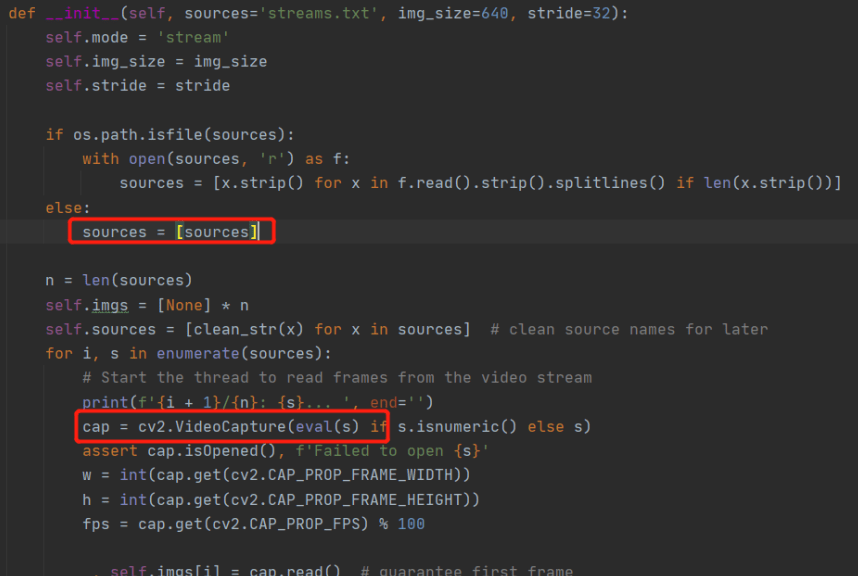 进入source参数里面查看,发现里面有一个默认的值,就是读文件,如果不是文件,就把source=[source],再进行source值遍历。在遍历中还使用到了opencv打开本地电脑的摄像机流,再开一个线程进行实时行人识别。
