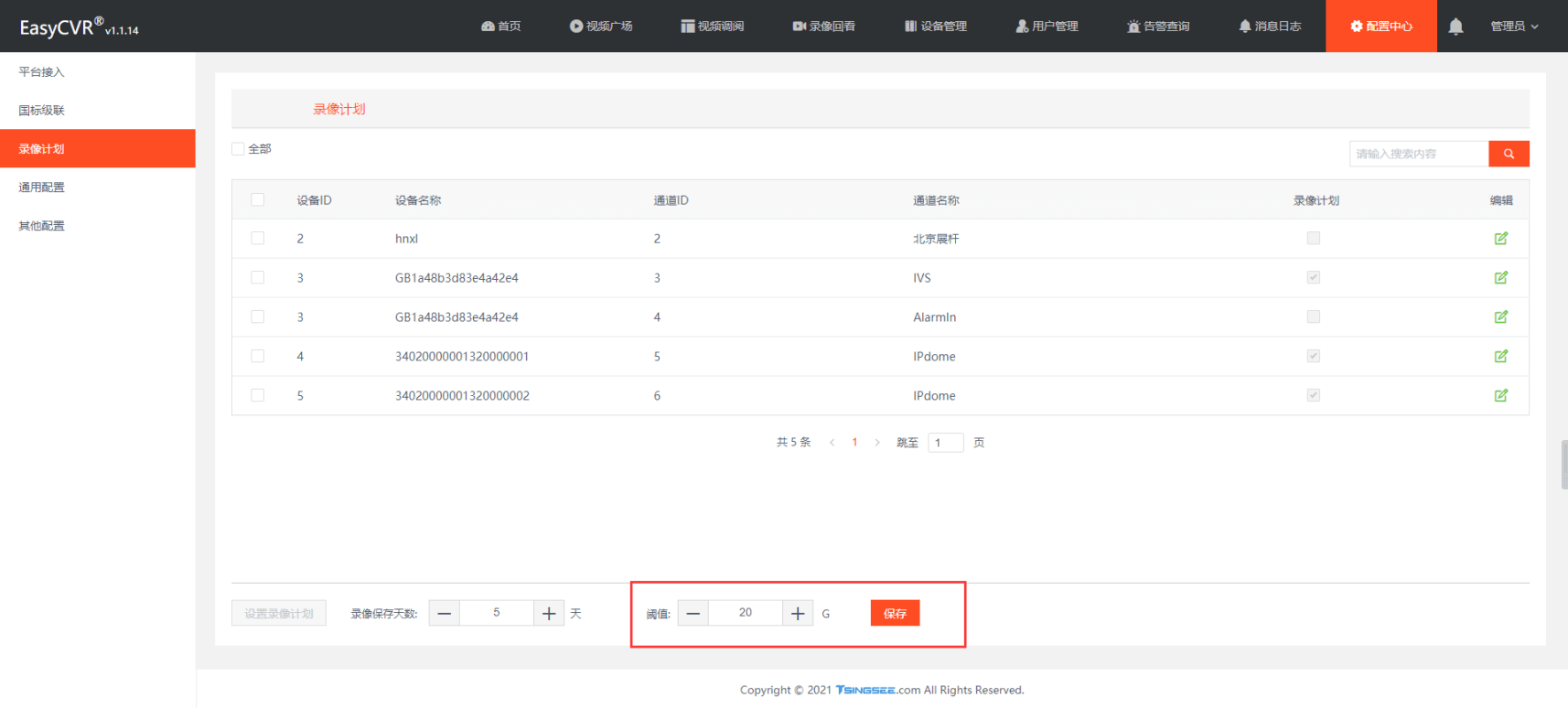 EasyCVR录像计划设置阈值的设定解释