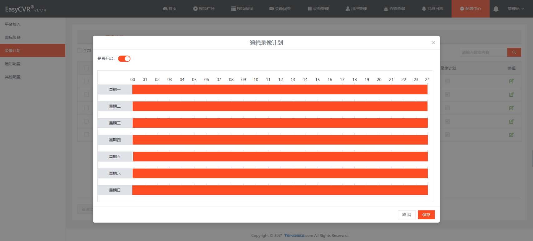 于是我们先检查了关于EasyCVR的录像相关配置,如下图,确定设置的是全天录像无误: