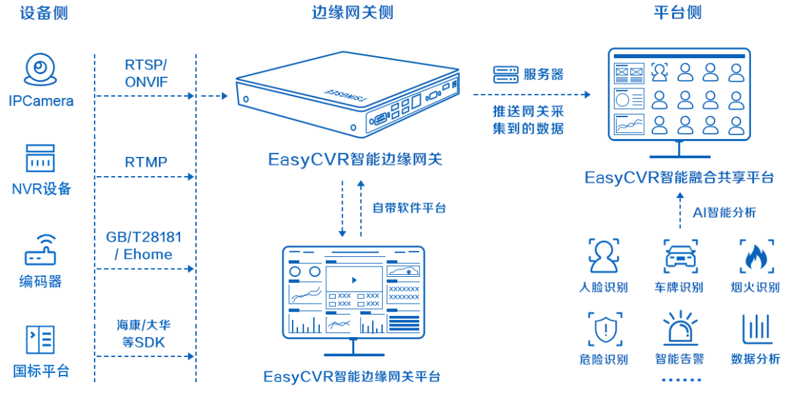 2.平台端:EasyCVR视频融合云服务,可以支持GB28181、Ehome、Onvif、RTSP、海康\大华SDK等协议接入到EasyCVR平台中。一方面平台可以兼容多协议设备的接入,另一方面平台兼具安防与智能科技,具有智能识别、分析与数据汇总的功能。