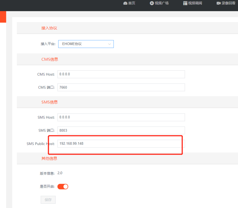 另外根据网络环境的不同,在配置里面的SMS也是需要设置的,如图所示的框选位置,若使用的平台和设备之前网络可以互通则在该位置填上服务器的IP即可;若是处在不同网络,比如服务器有公网地址,此位置填写服务器的公网IP。