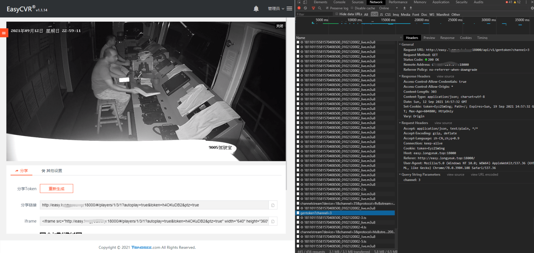 2、可以通过接口控制,/api/v1/gentoken,其中可以根据需要传递对应通道编号,如下,http://easy.******.top:18000/api/v1/gentoken?channel=3,此操作的目的是使3号通道分享链接重新获取新的token,接口会返回如下,其中token值为新值。