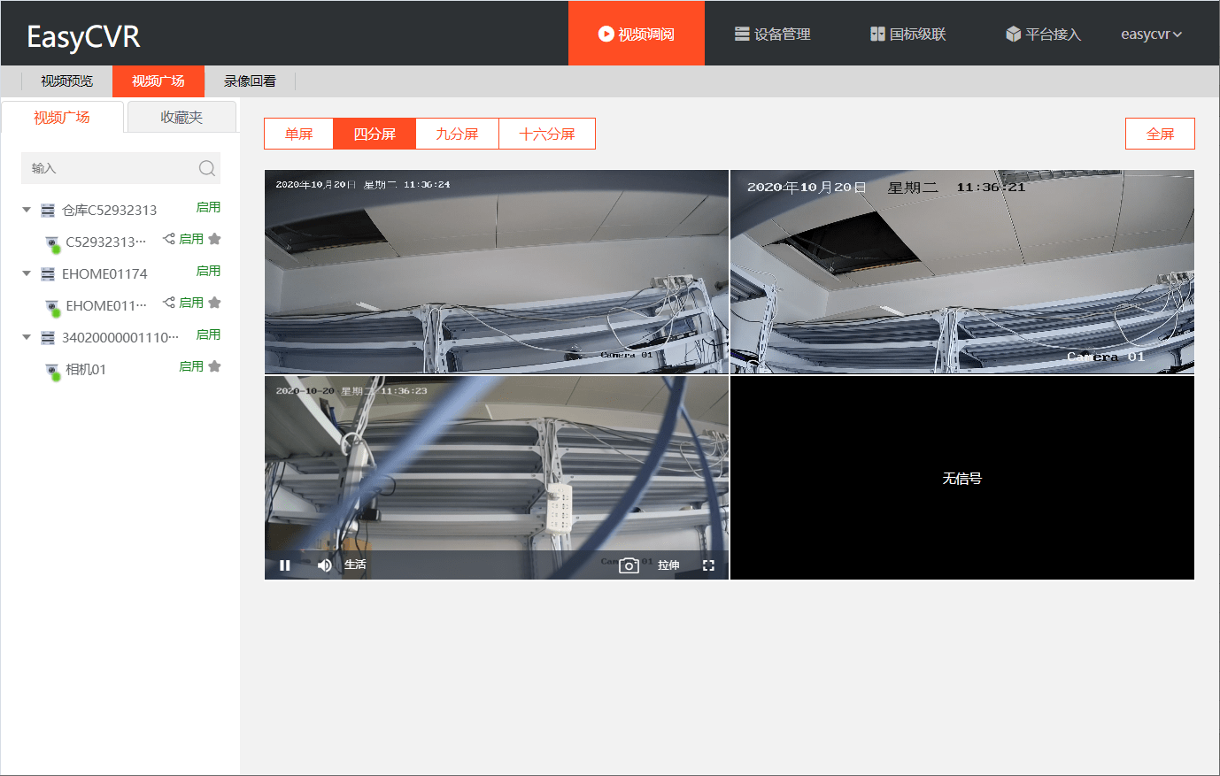 - 前端采集的视频信号通过国标GB28182协议或者主流的设备厂商海康私有协议,经过高压缩,占用较低的带宽,传输接入到EasyCVR管理平台上来。