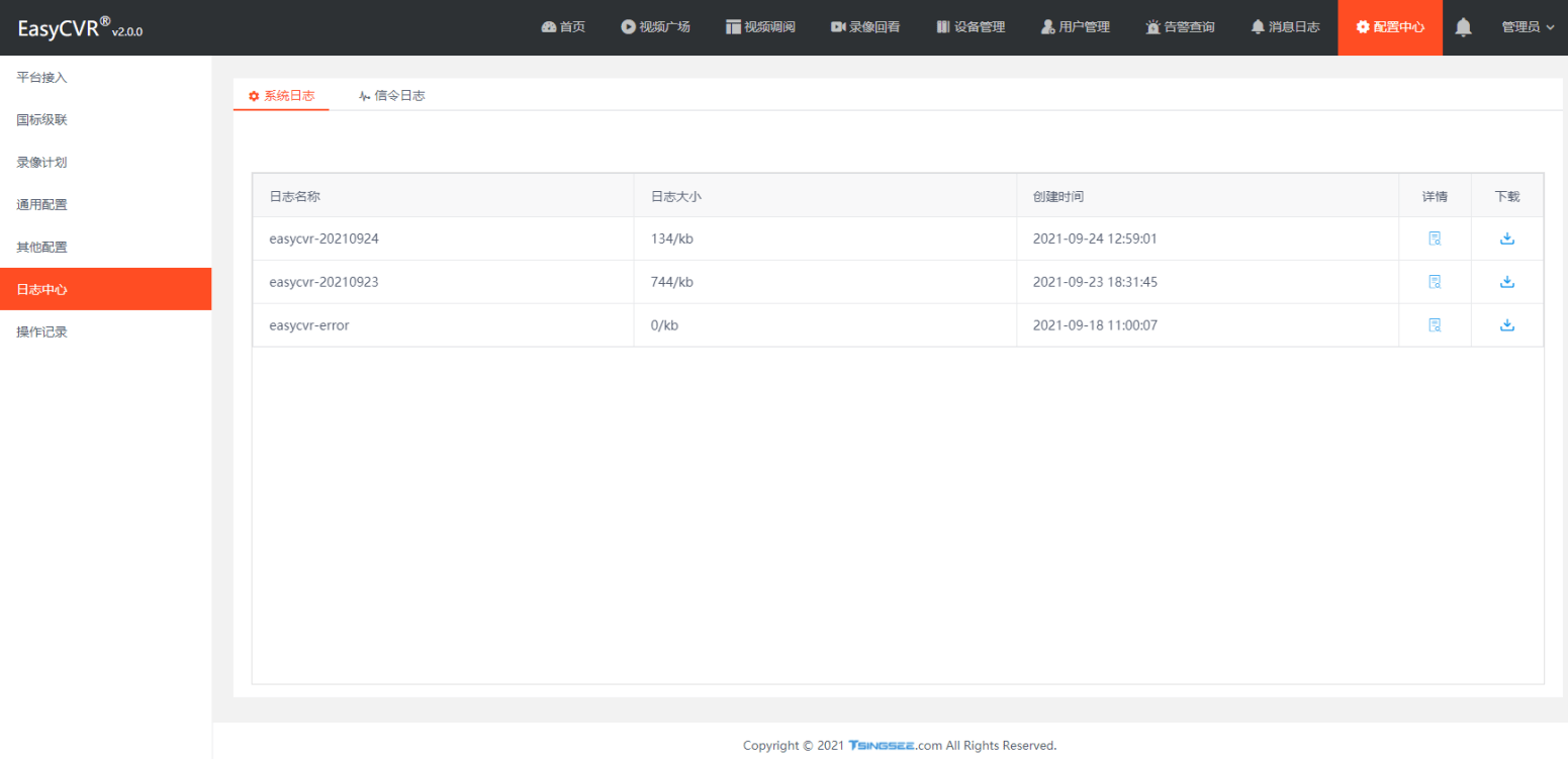 本文我们分享一下EasyCVR中日志中心功能的添加。首先分析该需求的实现目的,日志中心需要将后端的日志文件在前端展示出来,并且能够直接提供下载。实现后效果如下,日志可直接显示: