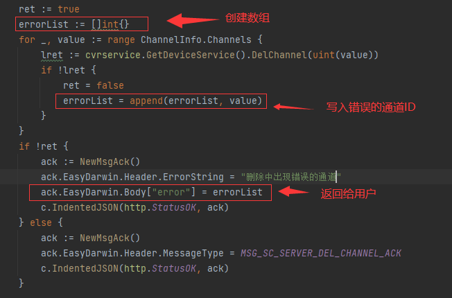 找到软件下的批量删除接口添加如下代码,当如果删除有失败的通道,返回失败的ID,告知用户那些通道删除失败。如果是成功就直接返回成功。