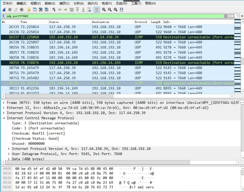 1.Ehome离线之后,我们去抓包看一下7660的UDP端口是否有流注册过来:
