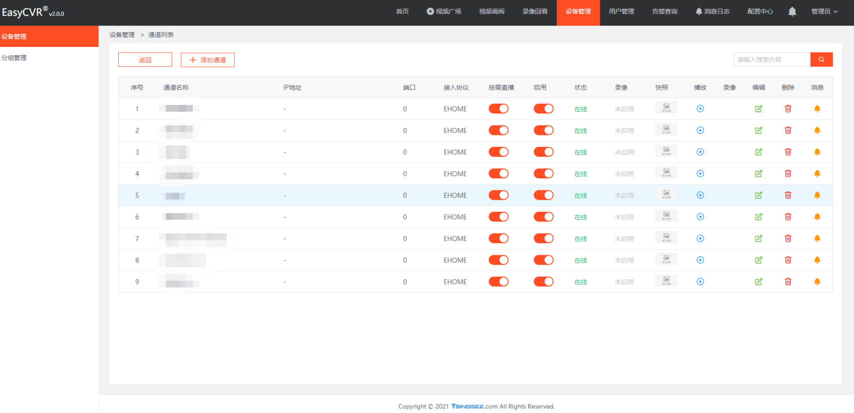 2.上图可以看到,7660的端口是有数据过来的,我们在EasyCVR的web页面查看配置的ip是否正确: