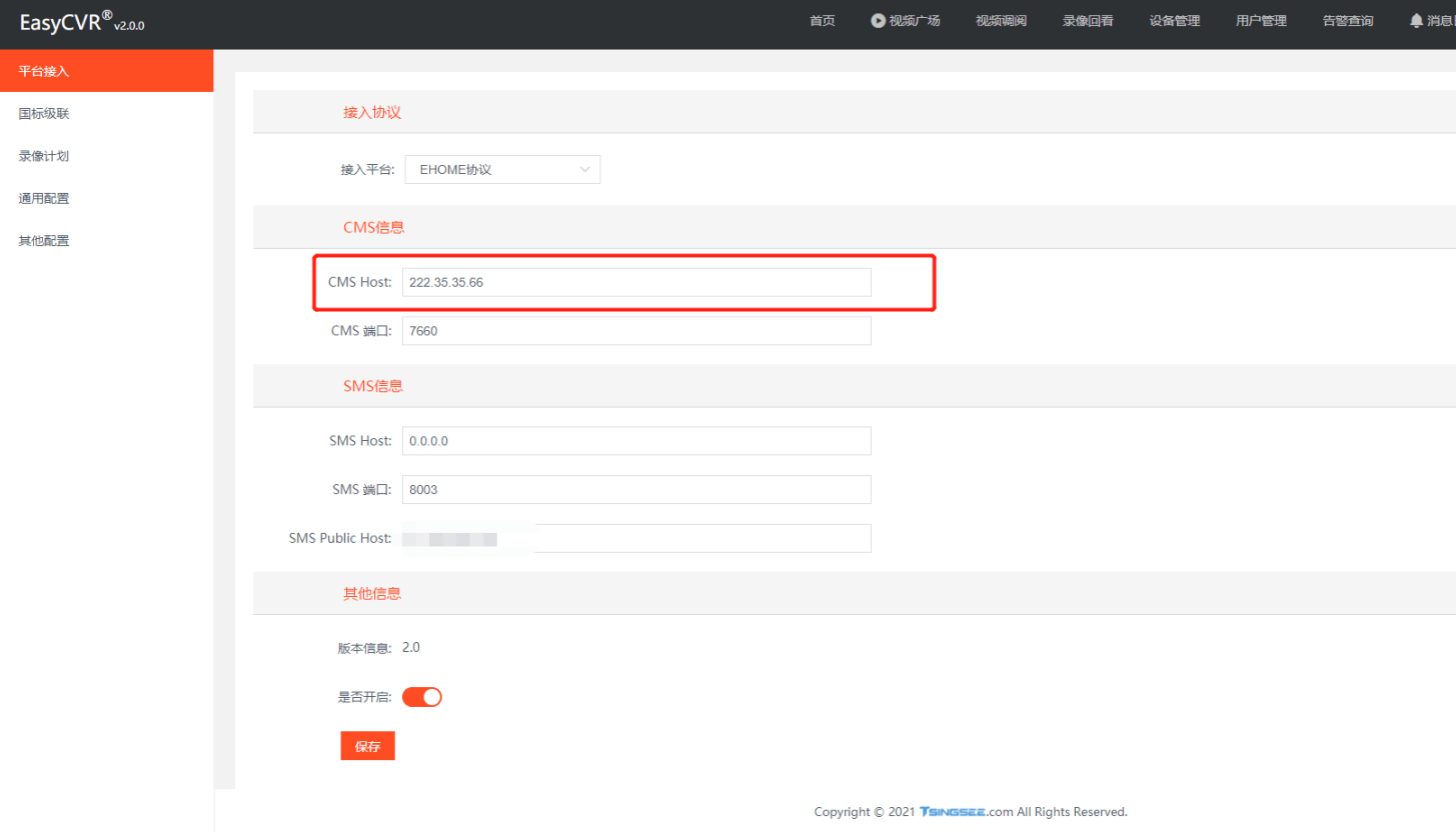 4.CMS的ip地址默认为0.0.0.0,这个意思是默认监听所有的网卡。如果单独配置一个ip地址会导致单独监听此ip的网卡,其他的网卡不进行监听,所以导致公网Ehome发送的流不被接收,我们将其改为默认的0.0.0.0,然后重启EasyCVR就可以了。