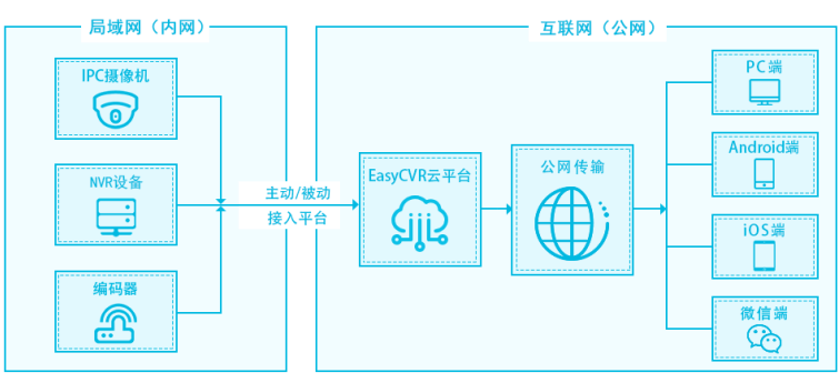 - 设备端无公网IP,可通过GB/T28181、Ehome协议接入到EasyCVR中,也可在内网安装EasyNTS设备,与公网建立传输通道,这样即可通过海康SDK、Onvif/RTSP接到EasyCVR中。