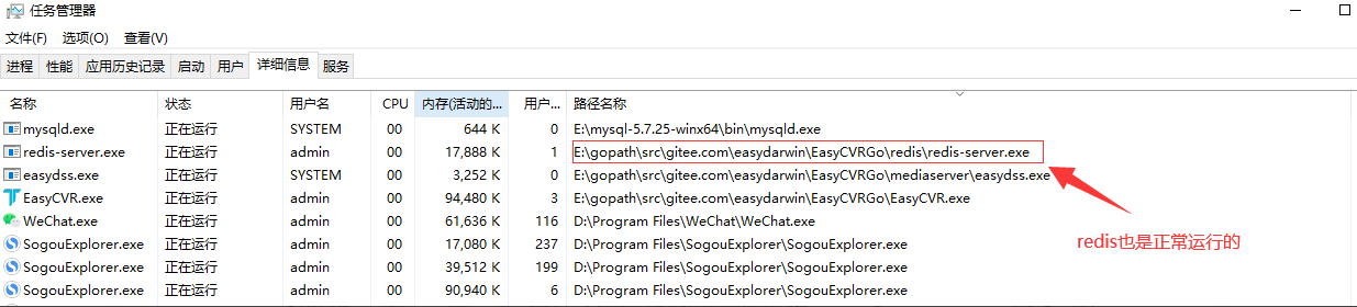 我们进到任务管理器中查看,在任务管理器中发现redis也是正常的。
