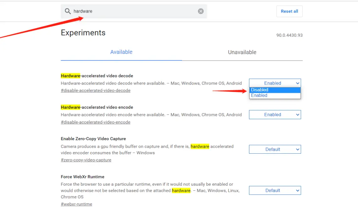 搜索hardware找到硬件加速这一栏将Enable改为Disable禁用并且重启: