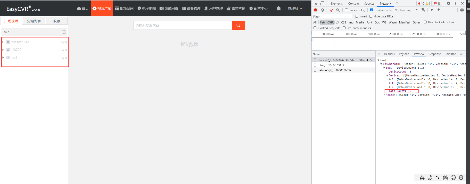 在设备列表接口查询设备数量时,应该先判断当前服务器是否开启了集群,如果没有开启集群,则在统计设备数量时,在SQL语句加入集群ID条件。按此逻辑修改后,集群设备列表返回的数量已经是正确的了,如图: