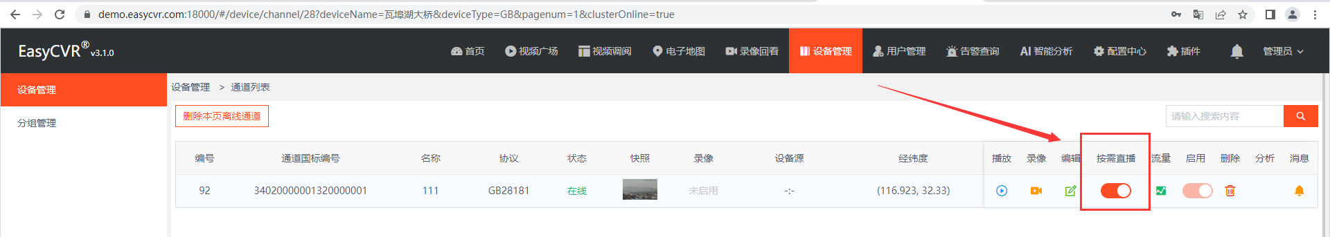 进入EasyCVR后台,依次点击【通道管理】-【查看通道】-【开启按需直播】,具体如下图: