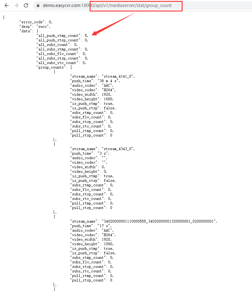 通过接口获知EasyCVR演示平台目前5路播放,通道、播放时长等都可获取,此时即可排查哪几路播放、播放时长是否合理等,从而规避无效流量消耗。